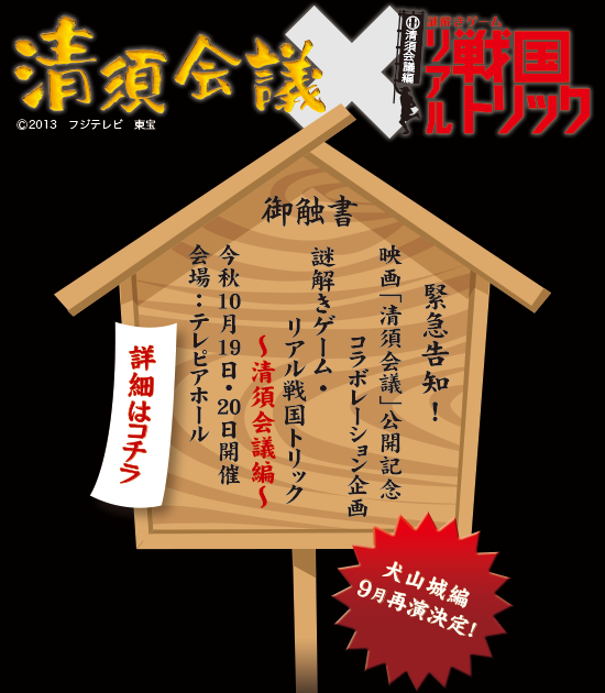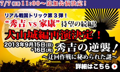『戦国時代』の史実を大胆に脚色し、その史実に関連するお城・史跡を舞台とした参加型謎解きゲーム。リアルゲーム、脱出ゲームのカテゴリに歴史を絡めた新機軸です。参加者は地図や暗号文などを手掛かりとして、会場に設置されたアイテムを発見し、謎を解いていきます。歴史に関する知識はまったく必要ありません。直感とひらめき、頭脳を柔軟にフル回転させてゴールに辿りつけ!